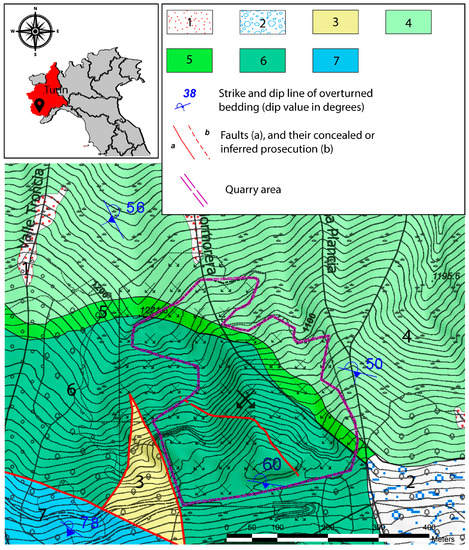 Location and geological map of the test site. Legend: 1—Slope and talus debris. 2—Undifferentiated glacial deposits. 3—Carnieules. 4—Puriac Limestone. 5—Marne Nere. 6—Lausa Limestone. 7—Entracque marl. Completed and modified after Reference [33].