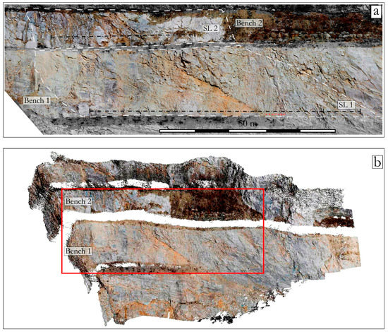 In Figure 3b, the 3D reproduction of the test site is shown. The photogrammetric survey consists of a series of overlapping images acquired with a Canon full frame DSLR coupled with a 50 mm lens. Ground control points for model orientation were dislocated over the quarry front and were acquired by using a rugged GPS tablet (Leica CS25 plus) able to reach a positioning error below 2 cm in the real time RTK mode. MicMac, an open source software, was used to perform tie point extraction, bundle block adjustment, dense image matching, and 3D reconstruction. The obtained cloud consisting of 7.7 million points has been interrogated by means of CloudCompare software for checking structural data using the Compass plugin [34]. A high resolution orthophoto (Figure 3a) with a Ground Sample Distance (GSD) of 1 cm/pixel was produced in order to measure joint spacing in non-reachable portions of the outcrop.