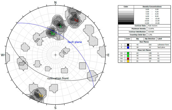 Stereoplot reporting the poles of the main discontinuity sets (S, K1, K2, K3) and the great circles of the front (Black) and fault plane (Blue).