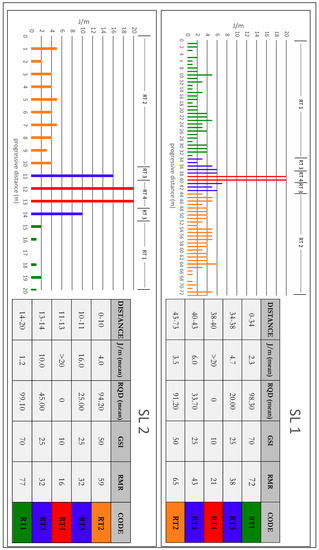 Considering arbitrary joint density thresholds, four lithotechnical units are identified and labelled RT1, RT2, RT3, and RT4, respectively. Quality (latu sensu) of the rock mass decreases from RT1 to RT4 (from Blocky, to Very blocky, to Disturbed to Disintegrated) since the number of joints per meter increases, and RQD, GSI, and RMR decrease.