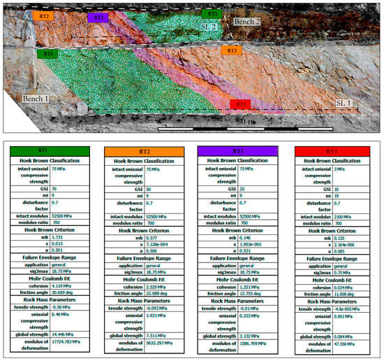 Figure 5 shows the location of the four litho-technical units on the two surveyed benches. In Figure 6, some geo-mechanical parameters [55] are calculated for every lithotechnical unit, by using the RocData software (Version 5.009, RocScience Inc.) (Figure 7).