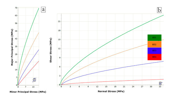 Principal stress plot (a) and Normal vs. Shear stress plot (b) for the four litho-technical units, after the Hoek-Brown criterion.