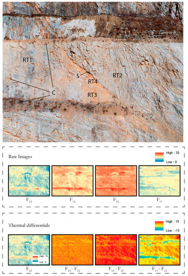 The winter measurement session was conducted from the late morning to the late afternoon on Bench 1. Figure 8 shows raw images and differences between every image and the first one. The solar radiation affects heavily the temperature pattern over the rock outcrop: a quite homogeneous increasing in temperature is shown, with some difference due to the orientation of the surfaces with respect to the position of the sun. For example, the darker loose deposit on the benches (C) has the higher surface temperatures at the start of the survey, and the lower ones at the end. They show a lower thermal inertia than the rocks outcropping in the quarry front. Moreover, it is evident that shaded sectors tend to heat less than the surroundings (cfr. Point S in Figure 8). This is consistent with literature data, which highlights the massive disturbance induced by sun heating [15,17,39]. Only the cooling down phase seems to highlight some peculiar pattern of the fault zone. However, images acquired after the sunset are not enough for providing data necessary for retrieving a cooling rate.