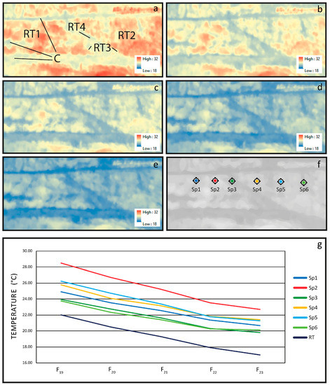 Looking at the raw images (Figure 9) from a to e (from 19:00 to 23:00), it can be noted that RT1 and RT2 portions are systematic with a higher surface temperature than RT3, RT4, and C portions (loose deposits with vegetation). The temperature trend over time shows an evident decrease, in every sector of the frame. Making some spot measurements (Sp1 to Sp6), it is possible to quantify the cooling rate of the single measurement points along a meaningful profile. The measured points are chosen along a line and include portions of sound rock, wet sectors, and fault rocks. Although a punctual measure may be affected by errors due to tripod instability and camera vibrations, this does not undermine measurement representativeness. Actually, images were aligned before measuring. Furthermore, variations in terms of the temperature of the adjacent pixel are not so significant. The error committed could be regarded as negligible.