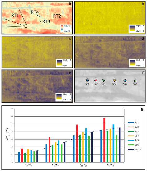 Figure 10 shows thermal differentials of every image compared to the first one, ΔTC. Portions of the bench with different thermal behavior are emphasized. In general, ΔTC between 0 °C and −8 °C are shown over the whole frame. Among the six measured spots, the wet portions (Sp3 and Sp6) have a lower final thermal differential (in e → ΔTC Sp3 ~ −4.0 °C and ΔTC Sp6 ~ −3.5 °C) while the dry rock areas show more consistent thermal losses (e → ΔTC Sp2 ~ −6 °C).
