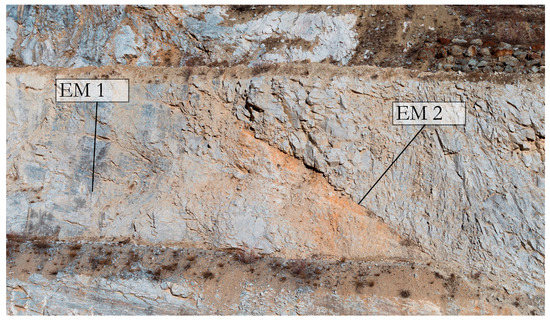 The main results of thermal conductivity, porosity, density, and temperature analysis are summarized in Table 3. The field five measurements on the main representative portion of the sound rock mass (EM1) as well as on the cataclastic zone (EM2) were conducted (Figure 12). Laboratory tests in dry and wet conditions (Table 3) were also performed. In both cases, each test represents an average of five values over 10 measures.