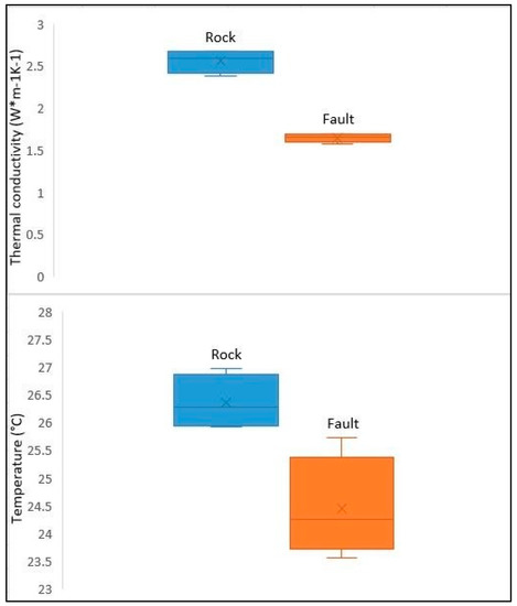 The sound rock seems to conduct far more than cataclastic fault (in dry conditions), due to the better thermal conductivity values both from field and laboratory surveys (Table 3). This could be due to many factors ranging from different physical, mechanical, and mineralogical characteristics. In particular, lower thermal conductivities of the cataclastic fault zone could be due to a higher content of clay minerals in its matrix or to a higher porosity in dry conditions.