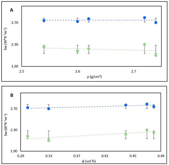 Wet thermal conductivity (λw, W*K−1m−1) from TLS (green circles) and TDB methods (blue circles) vs. density (ρ, g/cm3) in (A), and porosity (φ, vol %) in (B), respectively. Error bars represent standard deviation.