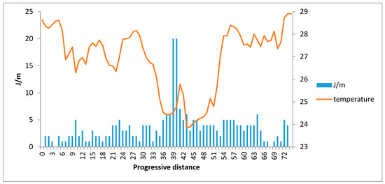 The summer measurement session, aimed at recording the cooling phase, highlights the different thermal response of the fault zone (RT3 and RT4) with respect to the low fractured sectors (RT1 and RT2). In fact, raw images show that the temperature of the fault zone, characterized by a higher degree of fracturing and low GSI, RQD, and RMR, is sensibly lower in every time step. This outcome is dissimilar from what is obtained in Reference [15]. In fact, authors report higher surface temperature for a high fractured portion of the rock mass. The difference can be ascribed to the hydraulic conditions of the discontinuities. In the case examined herein, there is a consistent water circulation, while, in the reference, the rock mass is in dry conditions. Figure 15 shows the comparison between the number of joint per meter and the measured temperature for the F19 frame on the SL1 scanline (Figure 9a). It is evident that an inverse relationship among these two parameters exist. This is due to the higher water content of RT3 and RT4 units. In fact, while the higher temperature is registered for the sound rock (~32 °C), the water that circulates in fractures at 16 °C cool down the fault zone up to 4 to 5 degrees (F19, Figure 9a). The inverse solution is also possible to apply toward detecting cooler sectors. Thus, the information on the degree of fracturing is possible to retrieve (i.e., SP6, Figure 9).