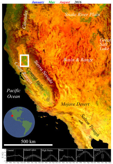 The colors on Figure 1 illustrate at a glance the typical thermal evolution of the region over the first half of the calendar year. In this figure, the blue, green, and red channels of the image represent land surface temperatures (LSTs) in January, May, and August of 2016, respectively. No locations are bright blue because the landscape is universally colder in January than in May or August. The Mojave Desert appears as yellow (red + green) because its temperature (bottom time series) generally mimics the annual cycle of solar insolation. In contrast, the Basin and Range takes longer to heat and maps with a more reddish hue. High elevations in the Sierra Nevada and Coast Ranges appear as dark red because seasonal snowpack results in low winter temperatures that then rapidly rise once the snowpack melts in late spring/early summer. Agriculture in the Central Valley and Snake River Plain appears green because surface temperature in the May image is generally elevated due to the low thermal inertia of bare, dry fields. Once crops have grown, however, the associated evapotranspiration (ET) significantly cools the landscape during the August image. This can be seen explicitly in the time series of typical annual thermal phenologies for Central Valley Rice from the MODIS sensor. In comparison, fields in the Central Valley left fallow, and the grasslands on the foothills of the Sierra Nevada and Coast Ranges, show annual thermal cycles more similar to the desert than the adjacent agricultural fields. Coastal areas, dominated by the thermal inertia of the Pacific Ocean and inundated in fog for much of the year, have a much lower amplitude annual thermal cycle. Inland lakes show somewhat more variability, but still are characterized by relatively cool, stable LSTs, therefore appearing dark.
