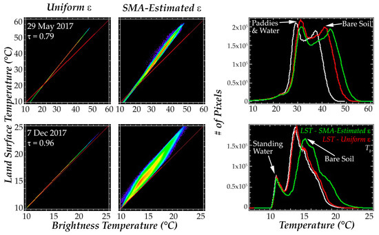 Effect of atmospheric correction and emissivity estimation on temperature estimates. In the case of a relatively low τ atmosphere and high insolation (top row, τ = 0.79), atmospheric correction increases T of rice paddies by about 2 °C and bare field about 4 °C. In the case of a high τ atmosphere with low insolation (bottom row, τ = 0.96), atmospheric correction changes T estimates by less than 0.5 °C. Using pixelwise ε estimates in the May image results in an additional 0.5 °C increase for paddies and a 2 to 3 °C increase for bare soil. In the December image, pixelwise ε results in no change in standing water but a 2 to 2.5 °C increase for bare soil.