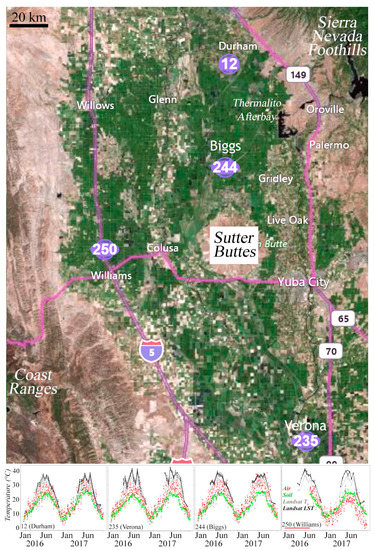 The primary rice producing region of California. The annual thermal cycle is captured by 4 met stations maintained by the California Irrigation Management Information System (CIMIS). Air temperatures (red) are generally higher and more variable than soil (green). Durham, Verona, & Biggs records are similar. The Williams station (installed mid 2016) has substantially lower air, but similar soil and brightness temperatures, to the other stations. Landsat Tb (black) generally records at the warm bound of the envelope of air T. Landsat LST is higher than Tb in all cases.