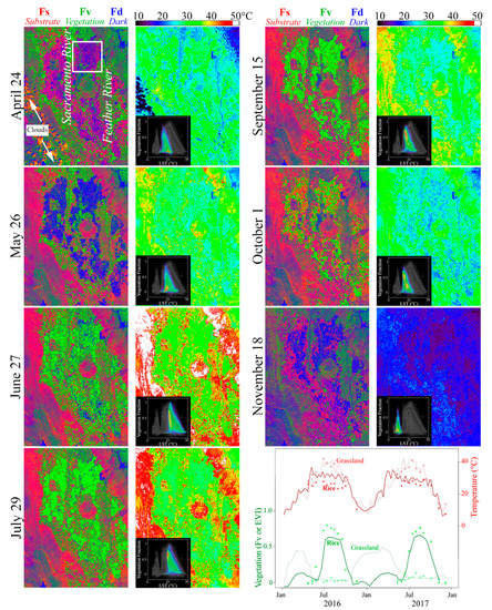 Multisensor evolution of land cover and temperature. Image time series shows Landsat EM fraction abundance (Fs, Fv, and Fd; 1st and 3rd columns) and LST (2nd and 4th columns). Fraction images show bare fields (dark red, mixture of Fs and Fd) prepared in Apr, flooded (dark blue, high Fd) in May, greening up from Jun to Sep (from dark green to bright green, tradeoff between Fd and Fv), senescing and being harvested (orange and yellow, tradeoff between Fv and Fs) in Oct and Nov. Thermal images are dominated by the seasonal cycle, with amplitude modulated by ET. Dry grasslands and fallow fields can reach summer LST of 20 °C greater than flooded rice fields. In winter, differences in LST between land covers are reduced. Inset plots show LST (X) vs. Fv (Y) for each scene (in color) relative to all 22 scenes from 2016 + 2017 (in grayscale). White box on the Apr image indicates the area used for the characterization shown in Figure 5 and Figure 6. Inset time series shows comparison between Landsat Fv + LST (dots) and MODIS EVI + Land Surface Temperature composites (lines).