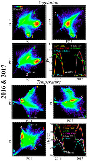 Figure 5 shows a comparison of the TFS for image time series of both Fv and LST for the year 2016. The TFS of the Fv image time series shows four distinct apexes representing the tEMs: Early Rice, Late Rice, Wetlands/Evergreen, and Water/Fallow. Time series of Fv corresponding to these tEMs are shown in the lower right. All 4 tEMs are clearly distinct on the PC 3 vs. 2 scatterplot. The point cloud in this scatterplot forms a cross shape, with the axis between tEMs 1 and 2 corresponding to phenological timing and the axis between tEMs 3 and 4 corresponding to overall vegetation abundance. The Water/Fallow tEM forms the sharpest corner, as expected given the small amount of variability expected in the Fv of water bodies and fallow fields through time. Early and Late tEMs are less sharp but still clearly defined, indicating substantial variability in the timing of the phenological signal. However, the Early and Late clusters are also visibly distinct, indicating two clear phenological groups. The Wetlands tEM is the most diffuse, as expected given the wide range of vegetation types, hydrological regimes, and land management strategies for wetlands in the area.