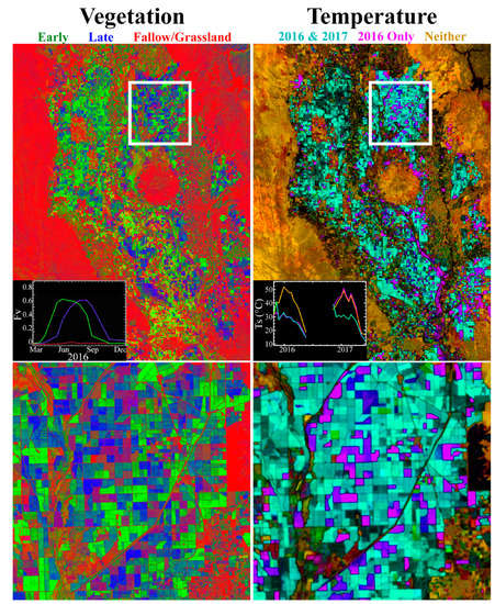 The right column shows the result of a 3 tEM temporal mixture model of 2016 + 2017 thermal phenology showing crops in both years (cyan), only 2016, magenta, or neither (dark yellow/orange). The unique temporal signature of rice thermal phenology allows it to be readily identified from other types of agriculture, which map as dull colors corresponding to combinations of tEMs. Field-to-field variations in the similarity of each pixel time series to the tEMs are present, likely due to a combination of soil moisture during the fallow year and/or greenup phase during the cropped year. Some intrafield variability is also present, likely for similar reasons.