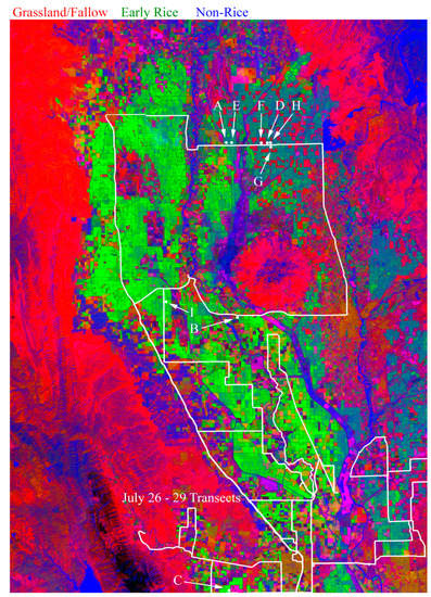 Finally, recent missions such as the ECOsystem Spaceborne Thermal Radiometer Experiment (ECOSTRESS), as well as the planned launch of hyperspectral missions such as NASA’s Surface Biology and Geology (SBG) and DLR’s EnMap, have the potential to substantially enhance the ability of the scientific community to map and monitor rice agriculture. During crop growth, VSWIR imaging spectroscopy has been shown to provide information about biomass [65] and foliar chemistry such as nitrogen and cellulose [66], and multispectral thermal measurements are expected to provide improved measures of evapotranspiration [67]. Hyperspectral measurements have also been shown to be potentially useful for detecting physiological stress in rice due to soil heavy metal content [68], fungal infections [69], and insect infestations [70]. When fields are fallow, hyperspectral measurements are expected to provide improved soil characterization [71,72]. It is possible that when this information is incorporated in temporal mixture models, it could potentially provide useful added information about the presence, timing, and spread of pathogens across a landscape; the need for fertilizer application; and/or water consumption and stress across rice and non-rice agricultural landscapes.