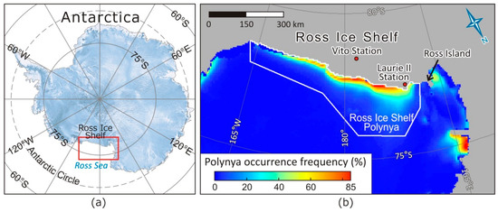 Polynyas are isolated open water areas surrounded by ice packs [1]. Coastal polynyas, also known as latent heat polynyas, are formed by divergent ice motion, and are driven and maintained by prevailing winds or oceanic currents. Active sea ice formation is found in coastal polynyas, along with brine rejection, which produces dense water [2,3]. The Ross Ice Shelf Polynya (RISP) is the largest coastal polynya over the Southern Ocean, with the highest sea ice production [4,5]. It has been regarded as an important source of Antarctic bottom water [6,7]. Polynya formation and ice production are related to a variety of environmental factors, including atmospheric forcing, currents, tides, air and ocean temperature, landfast ice, and iceberg drift [1,8,9,10,11].