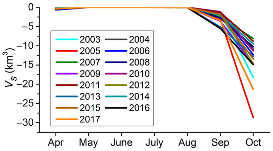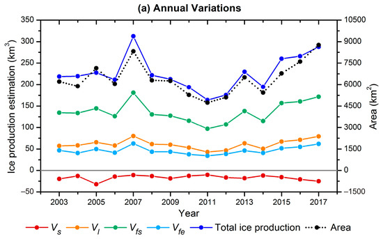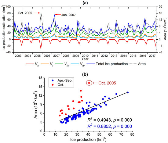 The largest negative value of Vs occurred in October 2005, coinciding with the RISP area monthly maximum in October 2005. In October, Vs was strongly negatively correlated to the RISP area (R2 = 0.9593, p = 0.000). Accordingly, this explains the inconsistency between ice production and polynya area in 2005, especially in October 2005: although the rapidly increasing RISP area in October 2005 enlarges Vl, Vfs, and Vfe, it also adds to the negative increasing of Vs. Therefore, the total ice production is balanced and only shows a mildly increasing trend instead of a sudden jump. The scatterplot in Figure 3b shows a significant linear relationship between monthly ice production and polynya area (R2 = 0.4943, p = 0.000). Without the October data, the R2 from April to September increases to 0.8852. Compared with the other data, the October data are more scattered and show relatively low ice production. Regarding the evidence in Figure 3a, the polynya area peaks in October of 2003, 2004, 2005, 2012, and 2017, but ice production only mildly increases or even decreases. This phenomenon did not occur from April to September because of the weak impact of solar radiation in the middle of winter. For example, the polynya area peaks in June 2007, September 2009, and September 2013 correspond to similar peaks in ice production with sharply increasing trends.
