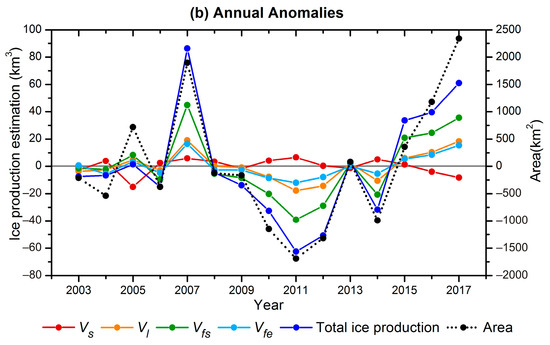 The interannual variation of RISP ice production is shown in Figure 2a, indicated by a dark blue line. Annual ice production during 2003–2017 exhibited substantial fluctuation between 164 and 313 km3. A linear regression model showed a slightly rising but not significant trend (R2 = 0.0332, p = 0.516). The maximum ice production occurred in 2007. The annual RISP area is indicated by the black dotted line. According to a linear regression, it was strongly correlated to annual ice production (R2 = 0.905, p = 0.000). The largest deviation to the fitting line occurred in 2005, when the area showed a peak while the ice production was relatively low. The anomaly plot of annual ice production and area confirms this result (Figure 2b). The area of 2005 showed a positive anomaly, while the ice production in that year showed only a weak positive anomaly.