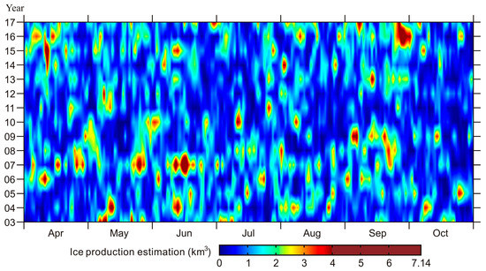 Figure 4 shows a Hovmöller diagram of daily RISP ice production. The X-axis represents dates, from 1 April to 31 October, whereas the Y-axis represents years, from 2003 to 2017. No obvious seasonal trend can be observed from this plot. Extreme high or low ice production events occurred occasionally and irregularly in every month.