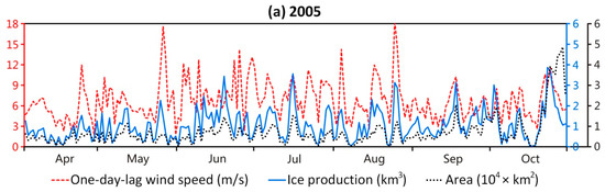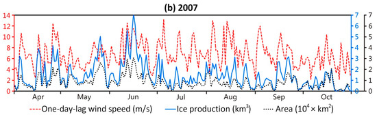 Time series of daily wind speed with one day lag, ice production and polynya area in 2005 (a) and 2007 (b).