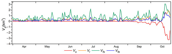 To further explore the two extreme events in October 2005 (maximum polynya area) and June 2007 (maximum ice production), Figure 6 plots the daily time series of one-day-lag wind speed, ice production, and polynya area in 2005 and 2007. By visual inspection, 68% of the peaks and valleys of one-day-lag wind speed and ice production coincide, and the correlations between them are weak but significant (R2 = 0.2137, p = 0.000 for 2005; and R2 = 0.2979, p = 0.000 for 2007). For October 2005, the peaks and valleys of wind speed and ice production coincide well, which means that the impact of wind speed on ice production is present. Polynya area abruptly increases to an extreme value at the end of October, while wind speed and ice production sharply decrease, leading to an inconsistency between area and ice production. This most likely is the main reason why monthly area and ice production are inconsistent in October 2005 in Figure 3. Figure 7 plots the time series of daily Vs, Vl, Vfs, and Vfe in 2005. Comparing Figure 6a with Figure 7, we see that at the end of October 2005, Vl showed similar peaks with polynya area, Vfs and Vfe decreased similarly to wind speed, and Vs decreased more strongly, showing a variation opposite to that of polynya area. The total ice production is evidently reduced by Vs. The R2 values between wind speed and total ice production, Vs, Vl, Vfs, and Vfe and area in October 2005 were 0.4273, 0.2151, 0.2549, 0.4387, 0.4275, and 0.2411, respectively. Wind speed influences total ice production mainly via Vfs and Vfe, similar to the results over the whole time span. In June 2007, the variations of wind speed, area, and ice production largely coincided. Continuous high wind events kept the area and ice production at a high level. The R2 values between wind speed and total ice production, Vs, Vl, Vfs, Vfe, and area in June 2007 were 0.6428, 0, 0.6473, 0.612, 0.6103, and 0.6593, respectively. Note that solar radiation is absent in June. The impacts of wind speed on Vl, Vfs, and Vfe are all strengthened as compared to October 2005. This is because wind speed has a stronger impact on area, and Vl, Vfs, and Vfe are all directly proportional to area (Equations (1) and (7)).