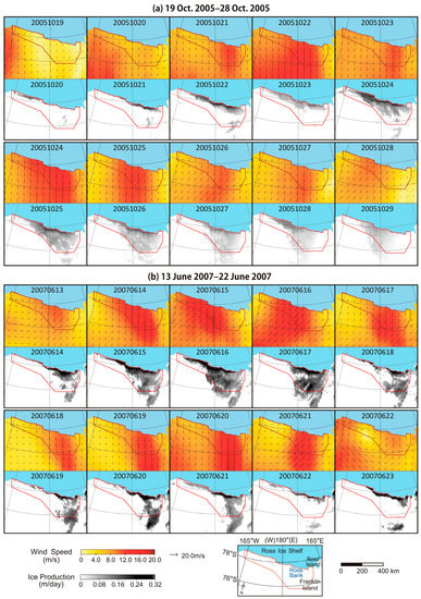 Comparison of wind forcing vector plots and ice production maps of the next day. In the wind forcing vector plots, the background color from yellow to red indicates wind speed from low to high. The arrows mark the wind direction, and the length of the arrows indicates wind speed. The ice production maps show the area of RISP where the color, from grey to black, indicates the ice production rate. Two extreme wind events lasting 10 days are shown in October 2005 (a) and June 2007 (b). At some dates the polynya area extends beyond the study area, which encloses the area with a polynya occurrence frequency >10% and excludes open water.