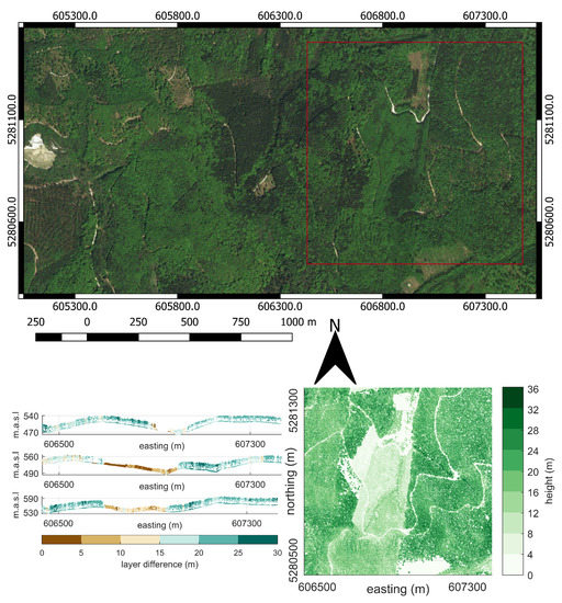In the last two decades, airborne laser scanning (ALS) has proven to be a feasible means for the derivation of forest metrics (e.g., [8,9,10]). ALS provides three-dimensional information of the vegetation distribution with high spatial resolution and with high accuracies [11,12]. Its advantage lies in the ability of the laser beam to penetrate the canopy layer [13,14,15], which enables the retrieval of detailed vertical canopy structure descriptions [16,17].