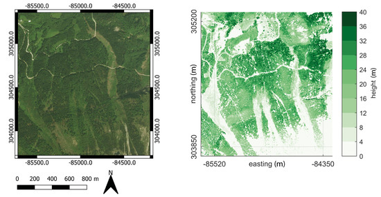 where denotes the number of points derived from the canopy, and is the total number of points in the respective neighborhood, i.e., canopy and non-canopy echoes. In this study, a canopy threshold of 3 m above terrain was used to distinguish canopy from non-canopy points.