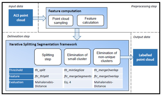 The flowchart depicts the outline of the proposed patch delineation framework. Structure features are computed from an airborne laser scanning (ALS) point cloud in a preprocessing step (Feature computation, see Section 3.1), followed by the actual delineation step in which the point cloud with the computed features are passed to the delineation framework (Iterative Splitting Segmentation framework, see Section 3.2). The delineation framework outputs the point cloud with the appended forest patch label to which the respective point belongs. The flowchart also lists the threshold values and the feature names that are used for controlling each of the three processing steps within the Iterative Splitting Segmentation.