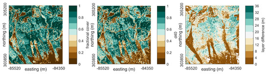 The computation of features for a subsample of the initial points with a sampling interval of 1 m reduced the number of points to and of the initial point cloud size for the Burgenland and Ötscher scenes, respectively. Maps of the spatial distribution for three features fractional cover, return height ratio d40, and canopy thickness vg_layerDiff are depicted in Figure 4 and Figure 5 for the Burgenland and Ötscher scene, respectively. Figure 4 further illustrates the impact of the search radius on the attribute computation.