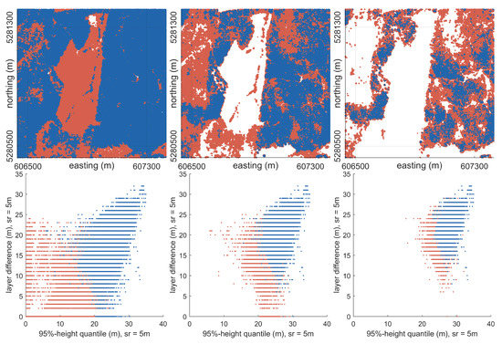 The functioning of the iterative splitting step is illustrated in Figure 6. Starting with the unsegmented point cloud, the maps in the top row depict the spatial distribution of the two resulting segments after each bipartitioning step for iterations 1–3. For a better illustration, only the splitting of the larger of the two clusters (colored in blue in each map) in terms of the respective point count is traced, while the smaller cluster (colored in red) after each splitting step is excluded from the visualization in the subsequent iteration. The scatterplots in Figure 6 (bottom row) show the attribute distributions of the two clusters in the respective maps in the h95–vg_layerDiff feature space after each splitting iteration.