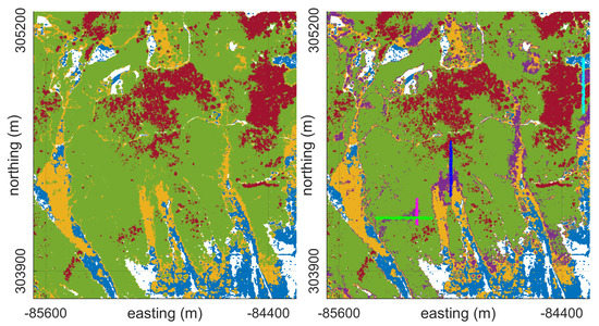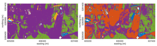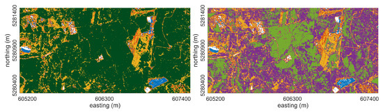 The metrics in Table 4 and in Table 5 indicate that the consistency is higher for the delineation into classes ( and for the Burgenland and the Ötscher scenes, respectively) than for the delineation into classes ( and for the Burgenland and the Ötscher scenes, respectively) when the h95 attribute is considered. The consistency for the attribute in general is lower in both scenes ( and for and classes, respectively, for the Burgenland scene; and for and classes, respectively, for the Ötscher scene).