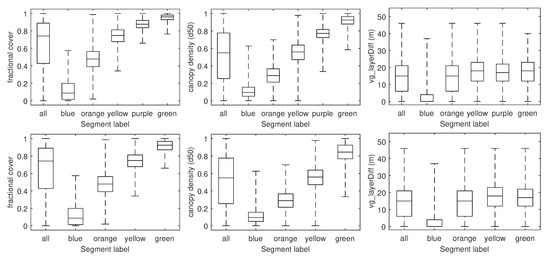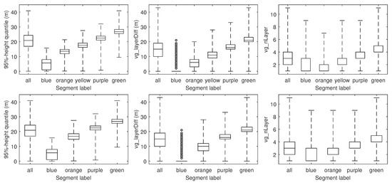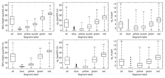 The delineation of forest areas with similar canopy height structure generates patches that well reflect the spatial variations of the h95 and attributes. The patches further reveal distinct differences in the profiles (Figure 11 and Figure 12) and in the attribute value distributions (Figure 9 and Figure 10), where the median values and the 25th –75th percentile ranges of the attributes show a distinct grading across the classes.