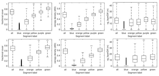 When the merging of overlapping clusters is performed more rigorously, resulting in patch classes, the consistency decreases to and for fractional cover and d50, respectively, for the Burgenland scene, and to and for fractional cover and d50, respectively, for the Ötscher scene. For this more rigorous merging, the two classes with the highest values for the d50 and fractional cover attributes are unified in both scenes. On the other hand, contrary to the two discussed attributes, the boxplots reveal that the canopy thickness (vg_layerDiff) is not a unique characteristic between the patch classes, as the class overlap is large (except for low vegetation, colored in blue in both scenes).
