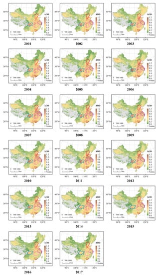 Aerosol optical depth (AOD), which is defined as the total attenuation of absorption and scattering of solar radiation by aerosols along the radiation transmission path, is one of the core parameters widely used for characterizing atmospheric aerosol properties [11] and evaluating their radiation radiative forcing and climatic effects [12]. In addition, AOD has been used as a proxy for particulate pollution by the air quality community [13]. Satellite-derived AOD products provide a unique tool to monitor aerosol properties at regional and global scales. Moderate resolution Imaging Spectroradiometer (MODIS) AOD is widely used to characterize the spatiotemporal change of atmospheric aerosols because it has been extensively validated and provides continuous observations extending for nearly two decades [14,15,16]. Numerous studies have used MODIS AOD to study the long-term spatiotemporal variation of aerosols at regional and global scales [17,18,19,20,21,22,23,24,25].