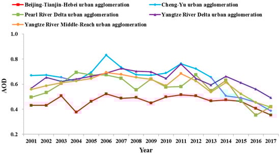 Multi-Time Scale Analysis of Regional Aerosol Optical Depth Changes in National-Level Urban Agglomerations in China Using Modis Collection 6.1 Datasets from 2001 to 2017