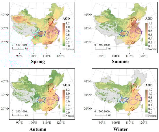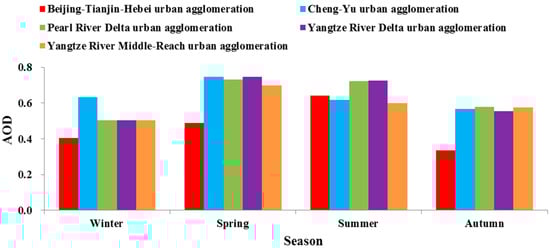 Figure 6. Seasonal averaged AOD values in five urban agglomerations.