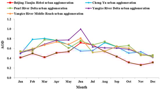 Figure 7. The monthly AOD changes over five urban agglomerations in China.