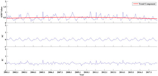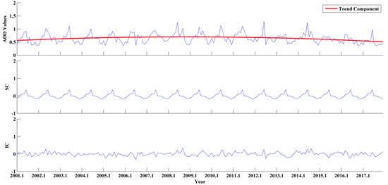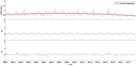 Time series decompositions of monthly AOD time series in the five selected urban agglomeration are shown in Figure 9, Figure 10, Figure 11, Figure 12 and Figure 13. In these figures, SC represents the seasonal component and IC represents the irregular component.