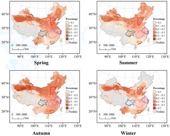 Figure 14. Seasonal distributions of AOD sampling frequency over five urban agglomerations in China.