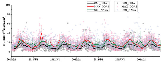 Figure 1 shows the spatial distribution of multi-year mean HCHO data from OMI-BIRA and OMI-NASA during the period 2010–2016. The daily averaged OMI-BIRA (in square dots) and OMI-NASA (in circle dots) data within 50 km around Xianghe station and the daily averaged MAX-DOAS data (in triangle dots) within the period 12:00–15:00 local time (LT) (corresponding to the satellite overpass time of 13:30) are shown in Figure 2. The black, red and green lines represent the monthly averaged OMI-BIRA, MAX-DOAS and OMI-NASA data, respectively. The vertical bars indicate one standard deviation. The comparison in the following section is based on these data.