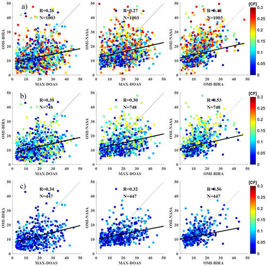 Based on the daily averaged data in Figure 2, comparisons were performed between the daily products of OMI-BIRA and MAX-DOAS, OMI-NASA and MAX-DOAS, and OMI-NASA and OMI-BIRA. To characterize the cloud effect on the comparisons, the effective cloud fraction (eCF), which is obtained from the OMCLDO2 cloud product [37], was classified using value ranges of 0–0.3, 0–0.2, and 0–0.1 for the three comparisons.