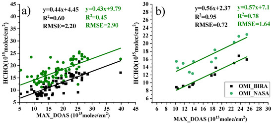 In this study, the OMI-BIRA and OMI-NASA HCHO products are compared with MAX-DOAS observations and with each other. The root mean square error (RMSE) between the satellite products and MAX-DOAS columns is used to quantify the systematic biases and is calculated following Equation (1).