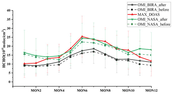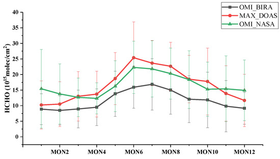 This section describes the monthly comparisons of OMI-BIRA and MAX-DOAS, and OMI-NASA and MAX-DOAS. The R2 values of OMI-BIRA and MAX-DOAS, and OMI-NASA and MAX-DOAS are 0.60 and 0.45, respectively, and the corresponding RMSEs are 2.20 1015 molec/cm2 and 2.90 1015 molec/cm2. These results are significantly better than the daily correlations in Section 3.1. The multi-year monthly average is shown in Figure 4b. The R2 of OMI-BIRA (OMI-NASA) and MAX-DOAS is 0.95 (0.78), with an RMSE of 0.72 1015 molec/cm2 (1.64 1015 molec/cm2). The correlation is significant within the 95% confidence interval. The multi-year monthly averages of the three datasets are shown in Figure 5. The multi-year monthly average of OMI-BIRA is significantly lower than that of MAX-DOAS. The largest difference occurs in June, reaching −9.472 1015 molec/cm2 (−59.4723%), and the smallest difference occurs in January, with a value of −1.337 1015 molec/cm2 (−15.05%), as indicated in Table 1. By contrast, the multi-monthly average of OMI-NASA is higher than that of MAX-DOAS from October to February, with a range of +9.70% to 33.74%, and is slightly lower in March–October, with the smallest difference occurring in September. October has the largest negative difference, reaching −16.28%. However, the difference is less significant than that of OMI-BIRA.