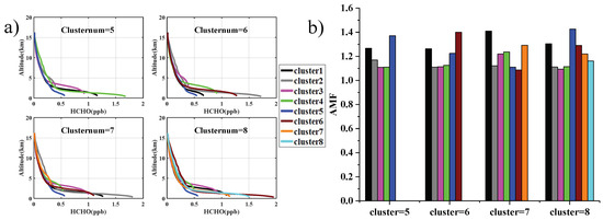 Cluster analysis of the HCHO vertical profile from GEOS-Chem in 2007 over China was performed, and the results of the 5–8 categories (NHCHO) are shown in Figure 6a. The AMF corresponding to the vertical HCHO distribution is shown in Figure 6b. The results show that the position and magnitude of the HCHO maximum between different clusters are well-defined and can represent background and hotspot regions (e.g., cluster5 (blue line) and cluster6 (brick-red line) for NHCHO = 8 represent low and high HCHO concentrations near the surface, respectively], in addition to elevation information (e.g., cluster3 (magenta line) for NHCHO = 6, cluster7 (orange line) for NHCHO = 7 and cluster4 (green line) for NHCHO = 8 indicate HCHO profiles of high elevation). NHCHO = 8 can fully reflect the influence of the vertical HCHO distribution on the AMF calculation. The maximum difference in the AMF between different clusters is approximately 20%. The test results for NHCHO > 8 show that the effect on the AMF reflected by the different classes is basically equivalent to NHCHO = 8.