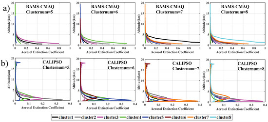 The aerosol extinction coefficient (AEC) clusters: (a) Regional Atmospheric Modeling System and Models-3 Community Multi-scale Air Quality (RAMS-CMAQ); (b) CALIPSO (NAEC: 5–8).