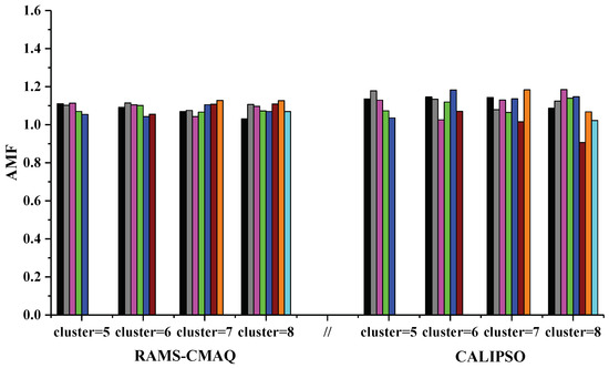 In this study, the AEC provided by Regional Atmospheric Modeling System and Models-3 Community Multiscale Air Quality (RAMS-CMAQ) and Cloud-Aerosol LIDAR with Orthogonal Polarization (CALIOP) are used to test the effects of AEC on the calculation of the HCHO AMF. The air quality modelling system RAMS-CMAQ has been used to investigate regional atmospheric pollution and environmental issues in many studies [2,38,39]. The regional model CMAQs can simulate various chemical and physical processes valuable for understanding atmospheric trace gas transformation and distribution [40]. CALIOP, which is aboard the Calipso satellite, is an elastic backscatter LIDAR that transmits polarized laser light at 532 and 1064 nm [41]. The LIDAR signal inversion begins at approximately 30 km above the ground and continues to the surface. Its orbit repeats every 16 days [42]. Wu et al. [43] noted that RAMS-CMAQ can reflect the vertical distribution of aerosols in China. The AEC peak is ~0.5 km above the ground, but it is underestimated (0.1 km−1) in north-western China and overestimated (0.3 km−1) in central and eastern China. Considering the low temporal resolution of Calipso, the observations of the RAMS-CMAQ and CALIOP datasets complement each other to some extent. The two datasets over China in 2013–2015 were used to perform cluster analysis, and Figure 7a,b shows the results of 5-8 categories (NAEC) for RAMS-CMAQ and CALIOP, respectively. Figure 7 shows that the magnitude and height of the AEC peak between different clusters are different and that the differences in the AEC among the classes are significantly larger for CALIOP than for RAMS-CMAQ. The RAMS-CMAQ classes show a similar vertical shape factor, which consistently decreases with increasing altitude. By contrast, CALIOP has a finer vertical resolution than RAMS-CMAQ and can reflect more complex features, e.g., the peak position changes from the surface to 2 km. The dependence of the AMF on the two AEC datasets is tested with an AOD set to 1 and an SSA set to 0.92. We find that the changes in the AMF caused by changes in the AEC types are relatively insignificant. As shown in Figure 8, for RAMS-CMAQ, the change caused by the AEC profile type is small (between 5% and 8%), and for Calipso, the change is larger (between 12% and 23%). When more categories are used, more subtle differences can be reflected.