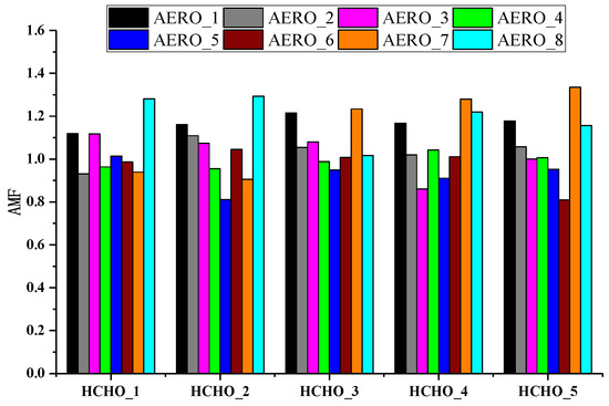When the HCHO vertical profiles of NHCHO = 5 in Section 3.3.1 and the CALIOP AEC profiles of NAEC = 8 in Section 3.3.2 are selected, the range of AMF variation in the group is 23–39% (Figure 9), substantially larger than the variability induced by changes in the vertical HCHO profile and AEC individually. Therefore, the relative positions of the HCHO and AEC profiles affect the AMF results. Consequently, in the AMF calculation, it is necessary to consider the combination of both.