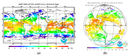 Composite maps of nighttime sea surface temperature (SST) retrieved with Advanced Clear-Sky Processor for Oceans (ACSPO on 4 April 2018 from (a) polar-orbiting Suomi National Polar-Orbiting Partnership Visible and Infrared Imager/Radiometer Suite (SNPP VIIRS) and (b) GOES-16 Advanced Baseline Imager (ABI) (the latter taken at 9:00 UTC). Both images are from the NOAA SST Quality Monitor (NOAA SQUAM) [35,36].